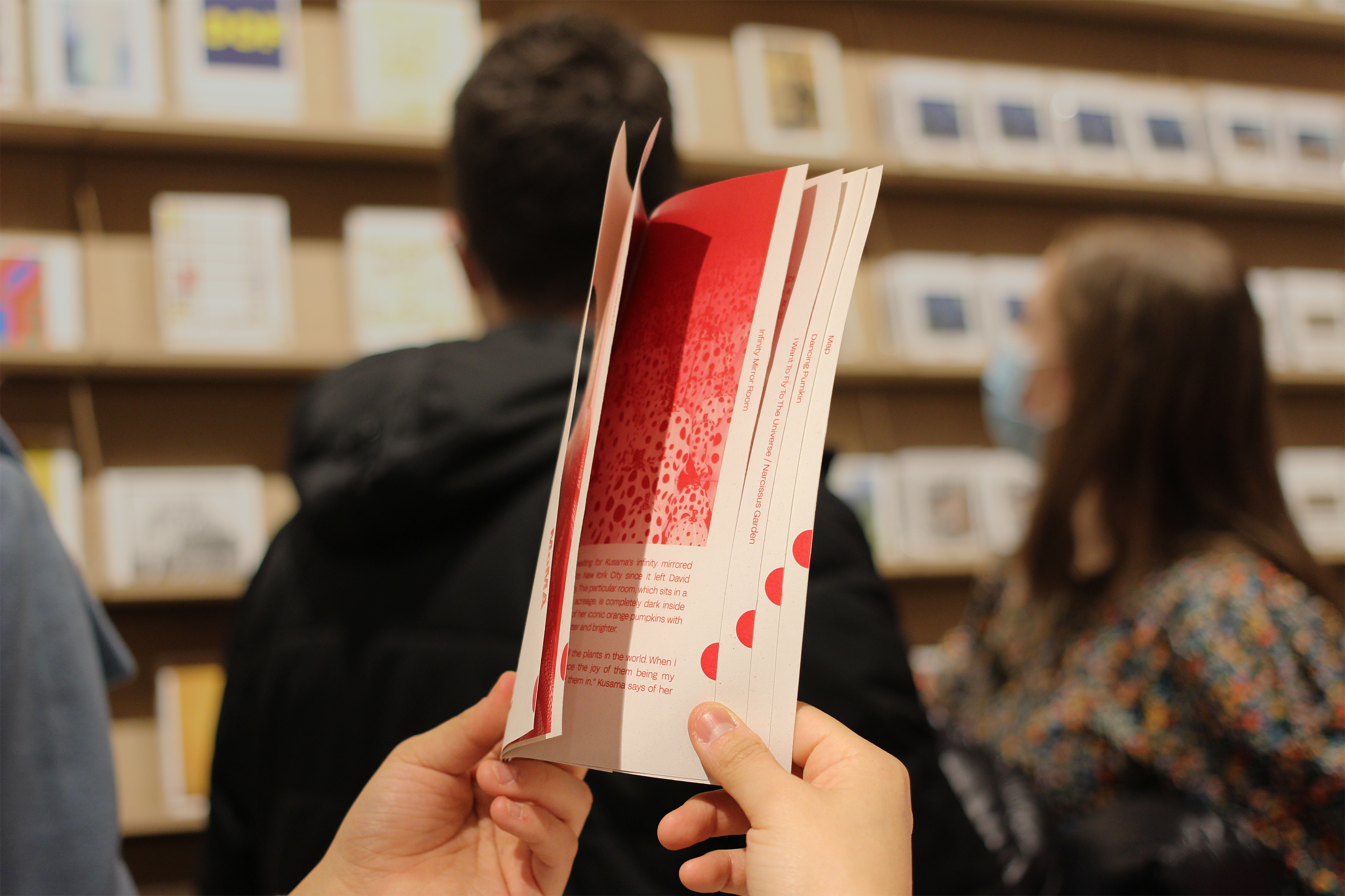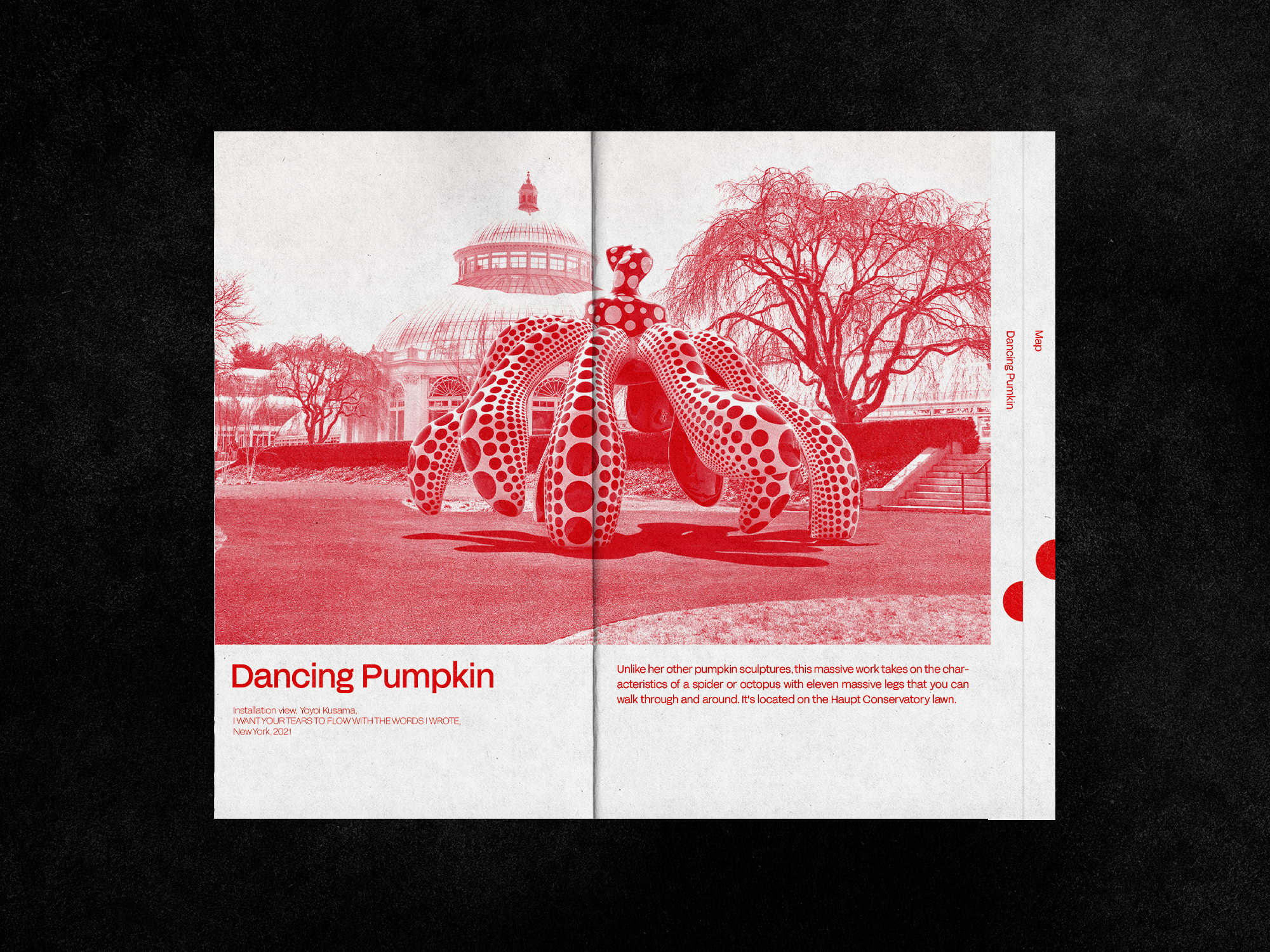 Yayoi Kusama is a Japanese contemporary artist. Her work is in based on conceptual art and shows some attributes of feminism, minimalism and surrealism. In order to capture the essence of Kusama's art, I created a brochure that incorporates her signature polka dots. The brochure includes a ticket that visitors can easily detach from the cover and keep as a souvenir. The center page of the brochure provides a concise yet comprehensive introduction to Kusama's artistic style by showcasing examples of her works and highlighting the key features that define her style, such as the use of repetition and vibrant colors.